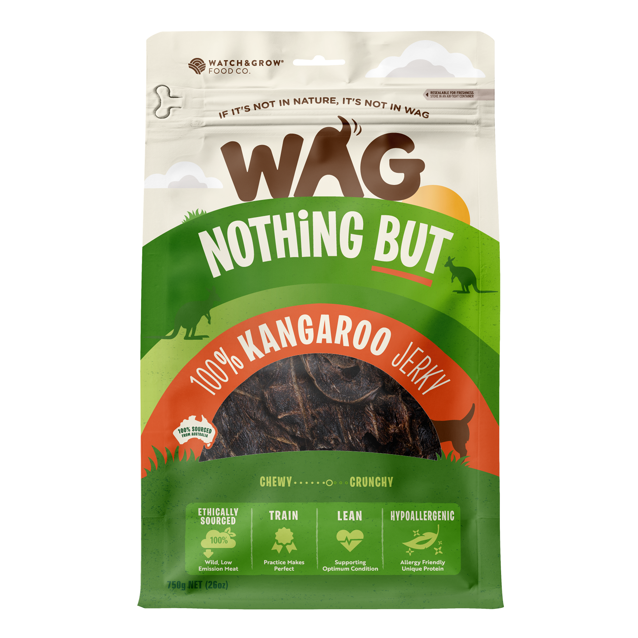 95 reviewsKangaroo Jerky is a 100% free-range and air-dried dog treat. Hypoallergenic and low in fat, kangaroo jerky meat contains high levels of Omega-3 and natural B12 Vitamins. A lean meat treat — with less than 2% fat — to keep your dog fit and trim, Kangaroo Jerky's guaranteed to be your doggo’s best friend.